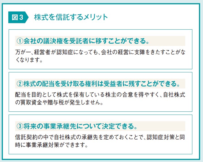 家族信託を認知症対策の手法と捉えたとき、個人であれば高齢期に入ってから検討を始める傾向にあります。しかし、経営に携わっている場合、万が一に備えて早めに対策をされる方も多くいらっしゃいます。家族信託を活用すれば、思い立った時に事業承継・認知症対策の仕組みを作ることができます(図3 株式を信託するメリット)。